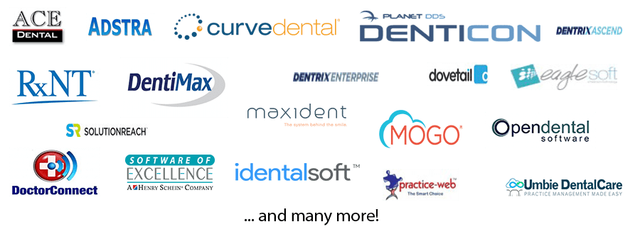 ✓ Works with Dentrix, Eaglesoft, Open Dental, Curve, DentiMax, and 50+ dental practice management systems